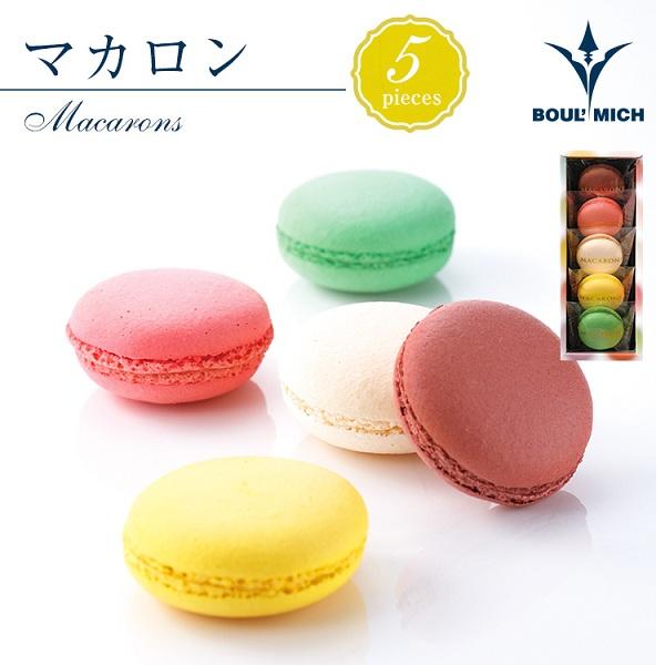 お返しとして定番人気のマカロン。銀座「ブールミッシュ」のマカロンは、5種類(ショコラ・フランボワーズ・ヴァニーユ・シトロン・ピスタチオ)の味が楽しめます。